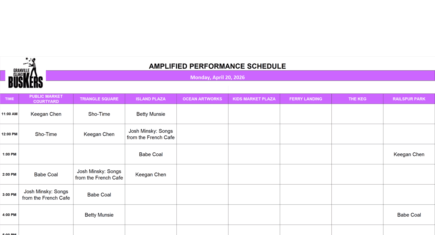 Monday, April 20, 2026: Outdoor Amplified Performance Schedule