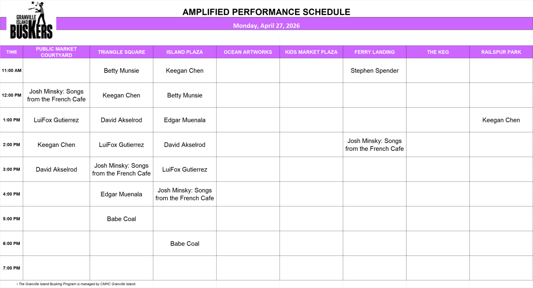 Monday, April 27, 2026: Outdoor Amplified Performance Schedule