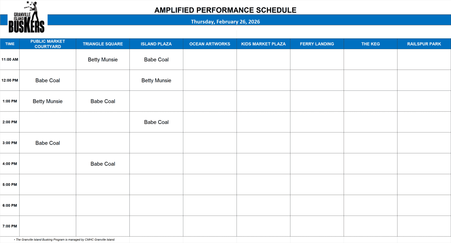 Thursday, February 26, 2026: Outdoor Amplified Performance Schedule