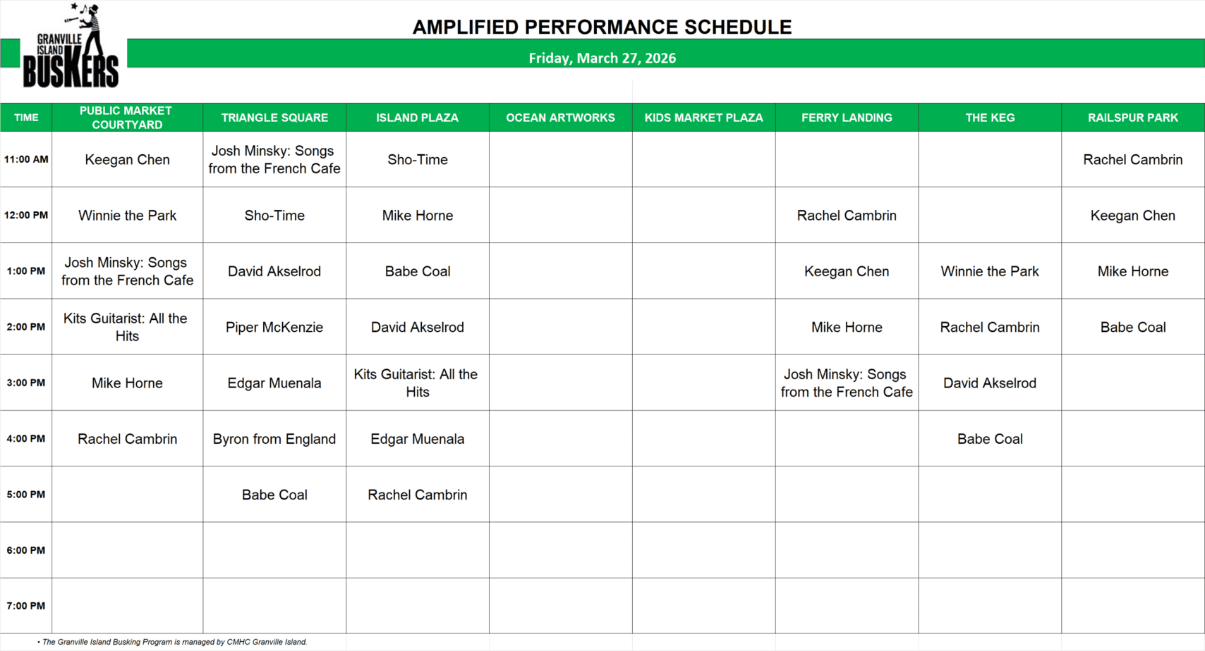 Friday, March 27, 2026: Outdoor Amplified Performance Schedule