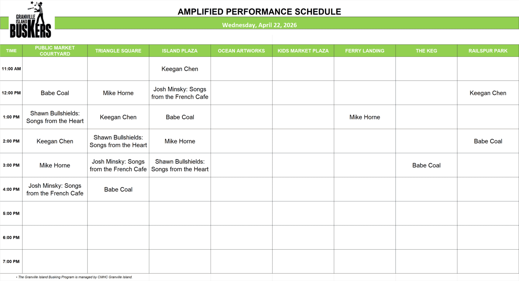 Wednesday, April 22, 2026: Outdoor Amplified Performance Schedule