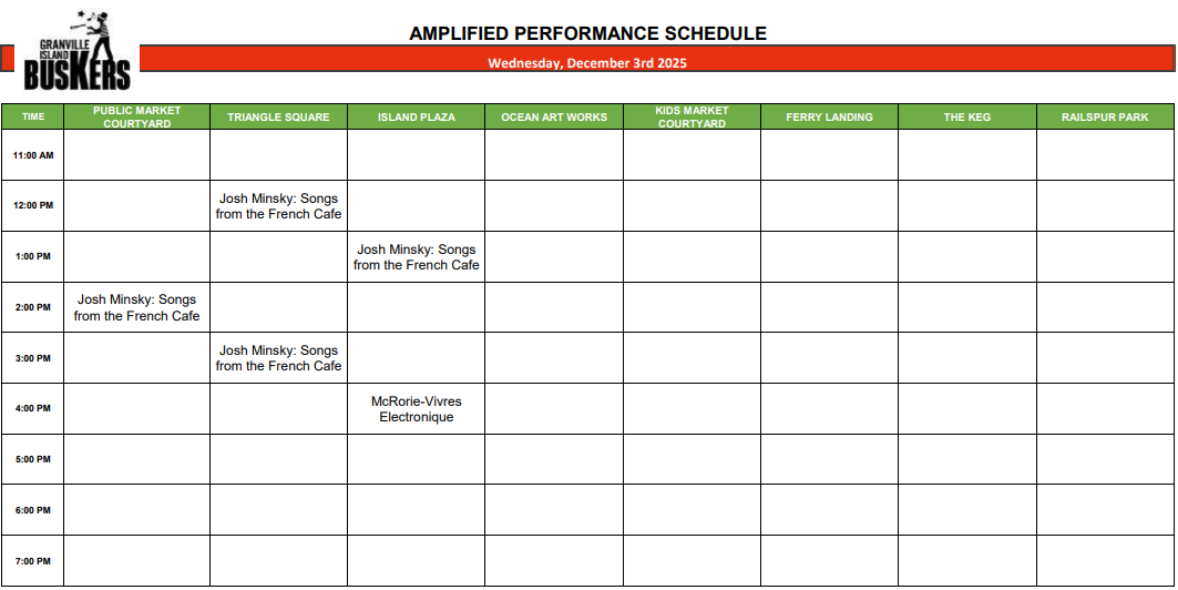 Wednesday, December 3 2025: Outdoor Amplified Performance Schedule