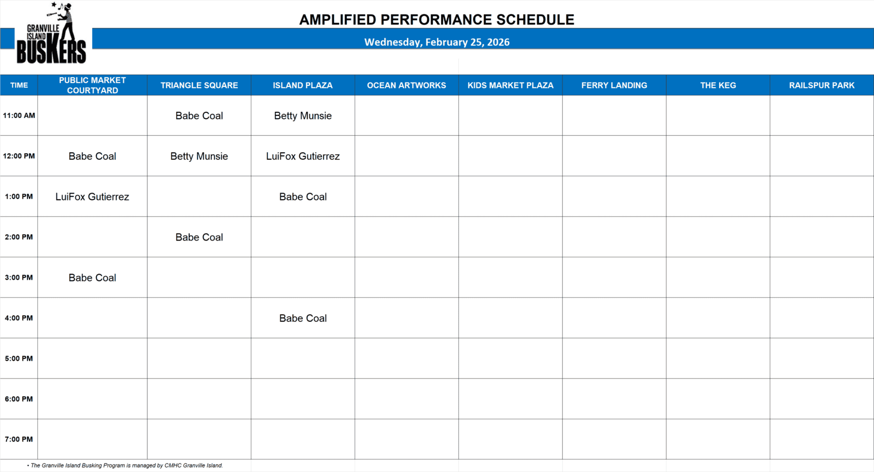 Wednesday, February 25, 2026: Outdoor Amplified Performance Schedule